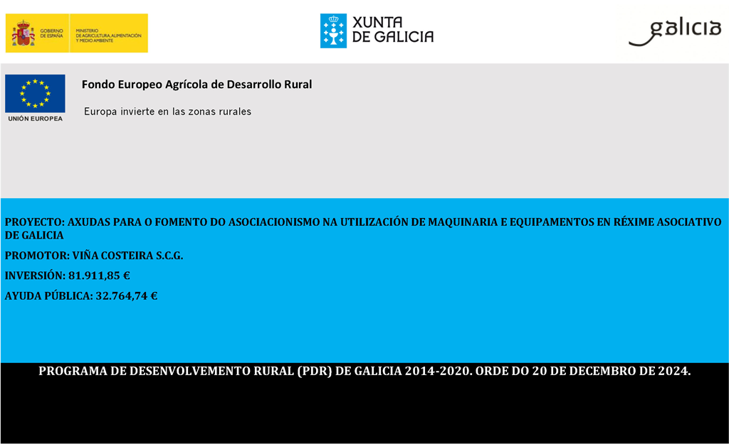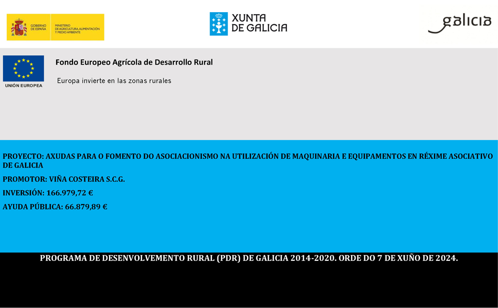 VIÑA COSTEIRA resultou beneficiaria da convocatoria Conecta Hubs para proxectos colaborativos nas áreas estratéxicas dos Hubs de innovación dixital que permiten avanzar na súa especialización e consolidación dentro do marco da RIS3 Galicia e cofinanciadas polo Fondo Europeo de Desenvolvemento Rexional (Feder) dentro do programa operativo Feder Galicia 2014-2020 (código de procedemento IN852C).