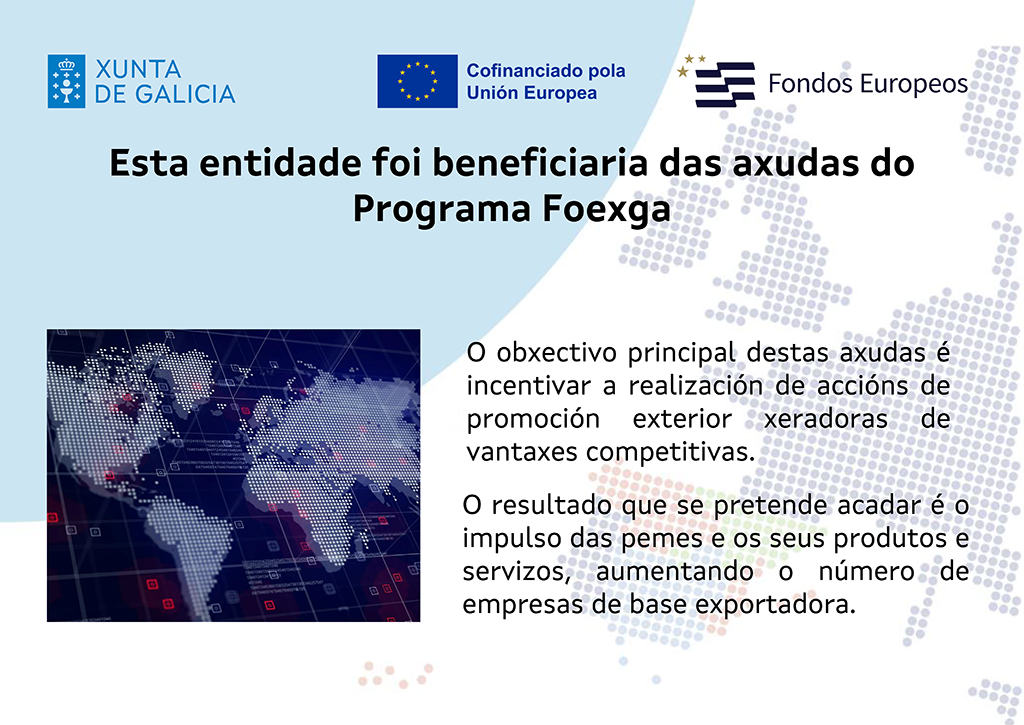 Esta empresa participa en un proyecto de internacionalización a través del programa de Igape Plan Foexga 2019-2020. El objetivo principal de estas ayudas es incentivar y estimular el comercio exterior gallego y la internacionalizción de las pymes gallegas. El resultado que se pretende es aumentar la base de empresas exportadoras y consolidar la presencia de empresas gallegas en los mercados internacionales.